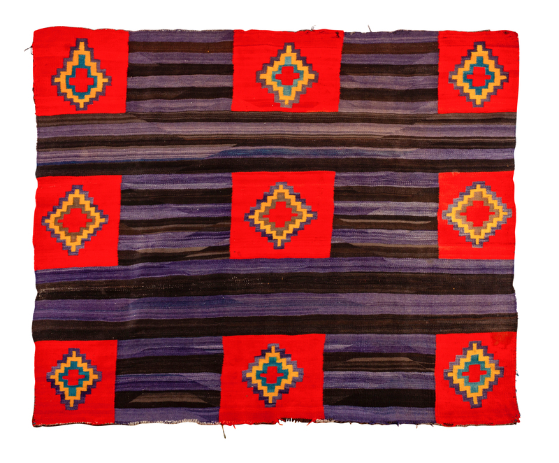 hand-spun wool woven in bright colors of red, yellow, purple, black, and blue; block anchor points containing stepped diamonds