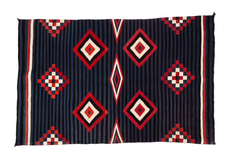 finely woven in colors of red, blue, black, and cream; banded design with elongated triangles and stepped diamonds