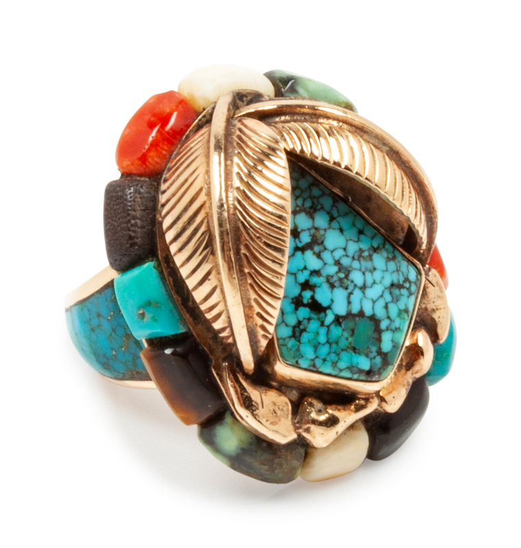 14k gold ring with turquoise, shell, and jet inlay, stamped Ben Nighthourse and 14k