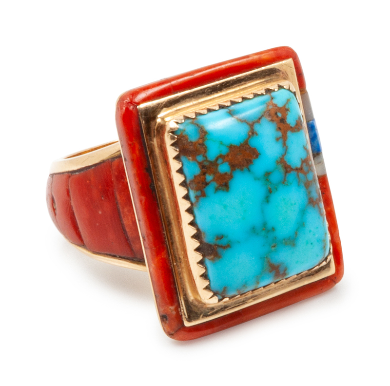 14k gold ring with turquoise and coral inlay, stamped Nighthorse and 14k