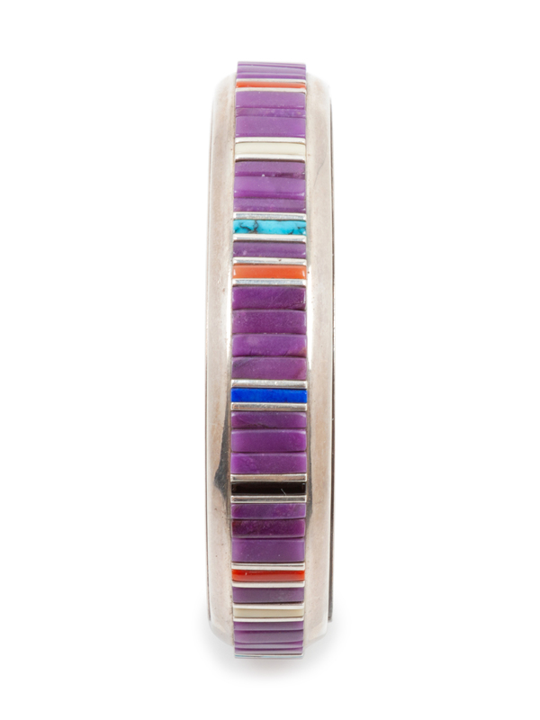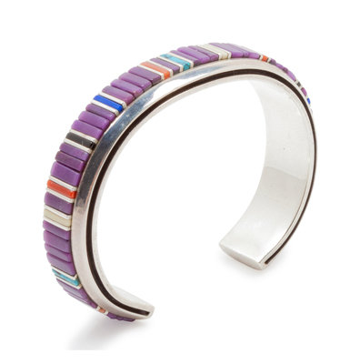 Sterling silver cuff bracelet with channel inlay, signed Bitsoi-Russell,