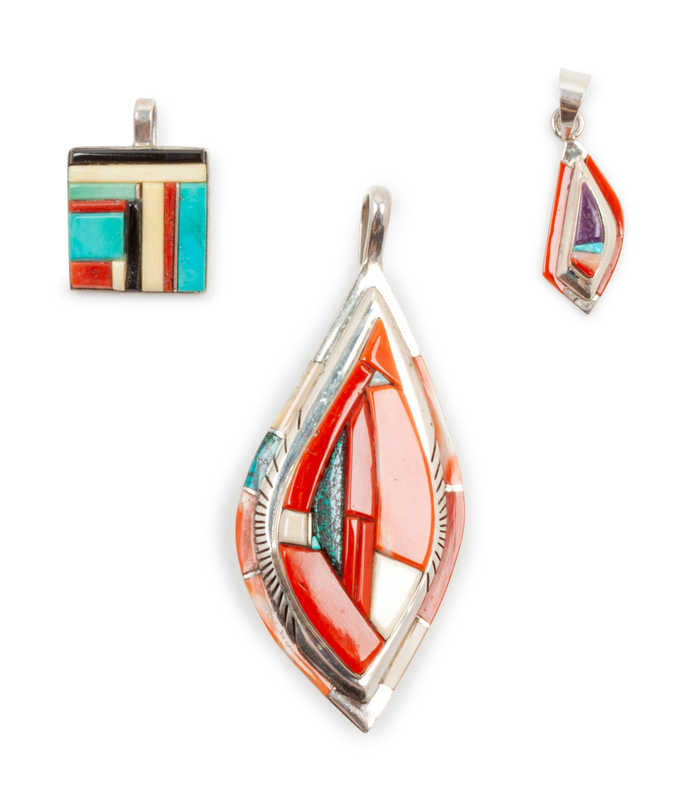 Group of three sterling silver pendants with stone inlay, stamped Ken Romero and Sterling