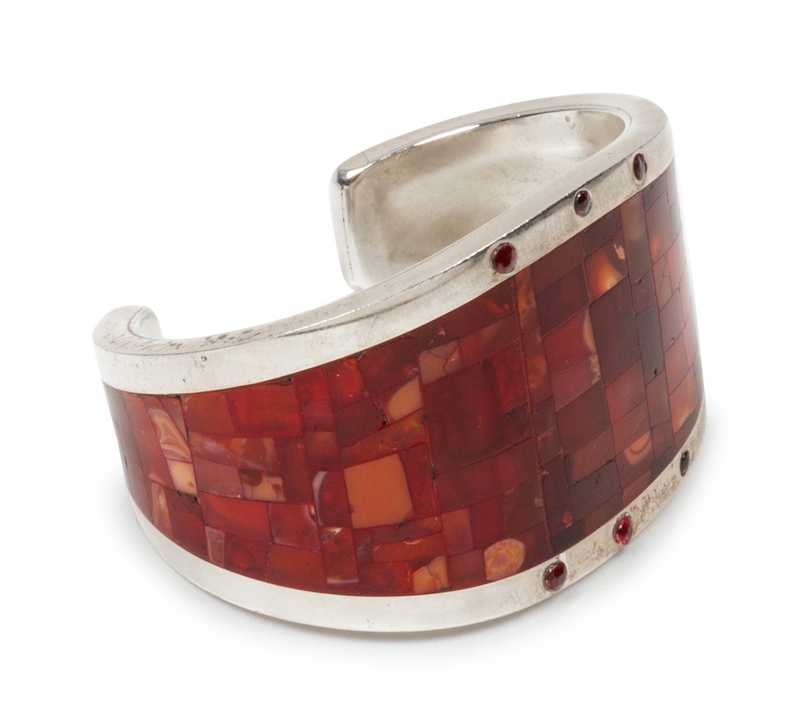 Silver cuff bracelet with spiny oyster mosaic inlay; stamped Colin Coonsis Limited