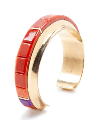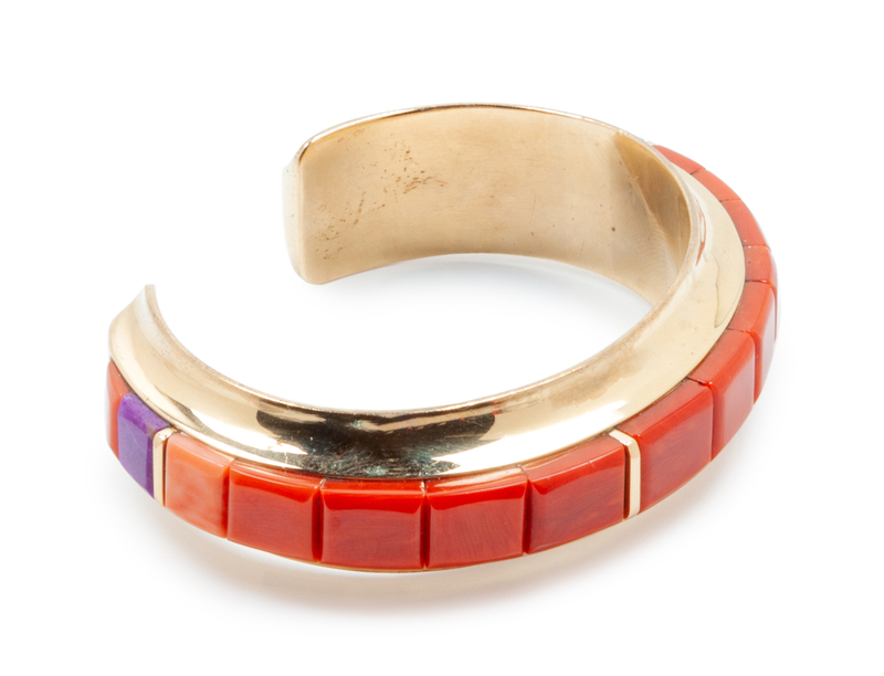 Yellow gold bracelet with coral and turquoise inlay, signed Victor Beck