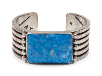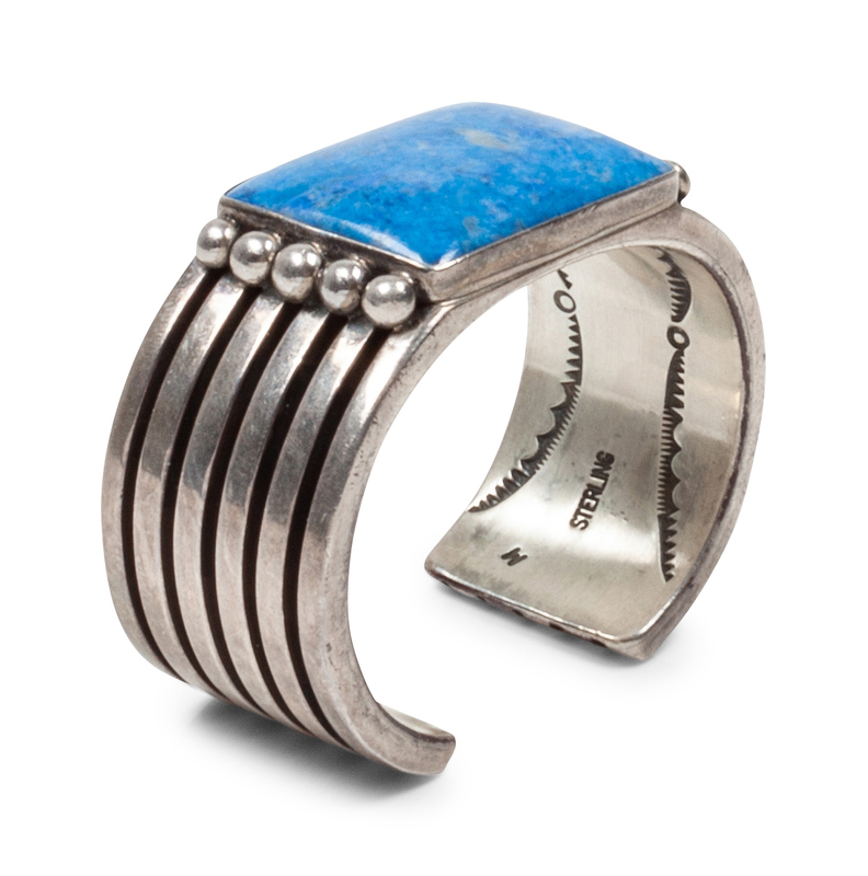 Sterling silver cuff bracelet with Lapis cabochon; stamped Orville Tsinnie, Shiprock, New Mexico and sterling