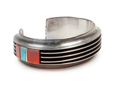 Sterling silver cuff bracelet with coral and turquoise inlay; signed Victor Beck
