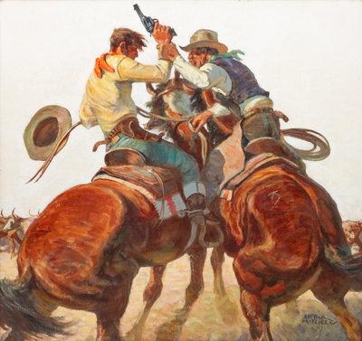 Two Cowboys on Horses with Gun, oil on board, signed Arthur Mitchell (lower right)