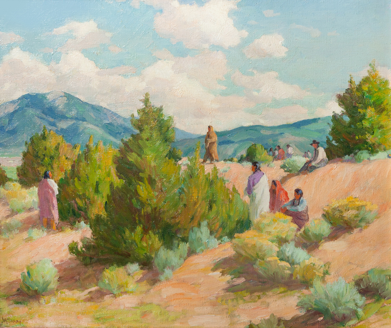 This is a depiction of the “arroyo”, or sand wash that was one of the main thoroughfares from Taos Pueblo to the town of Taos. This location is directly behind art patroness and cultural influencer, Mabel Dodge Luhan’s house, and not more than a half mile from Sharps’ home and studio. Sharp’s title “Ditch Workers” is perhaps a reference to the pace of life at the Pueblo in stark comparison to the Anglo drive of commercial progress, and/or perhaps it is a reference to the limited options available to many folks during the Great Depression. Long shadows of morning light give depth to the sage, chamisa and Taos Pueblo people with Taos Mountain in the distance rising to meet the passing clouds. Sharp’s masterful brushworks records a scene of every day life in Taos, now lost to us save for his canvas.