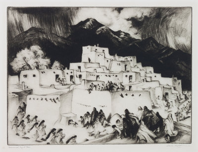 Ceremonial Day in Taos, etching, signed Gene Kloss (lower right)