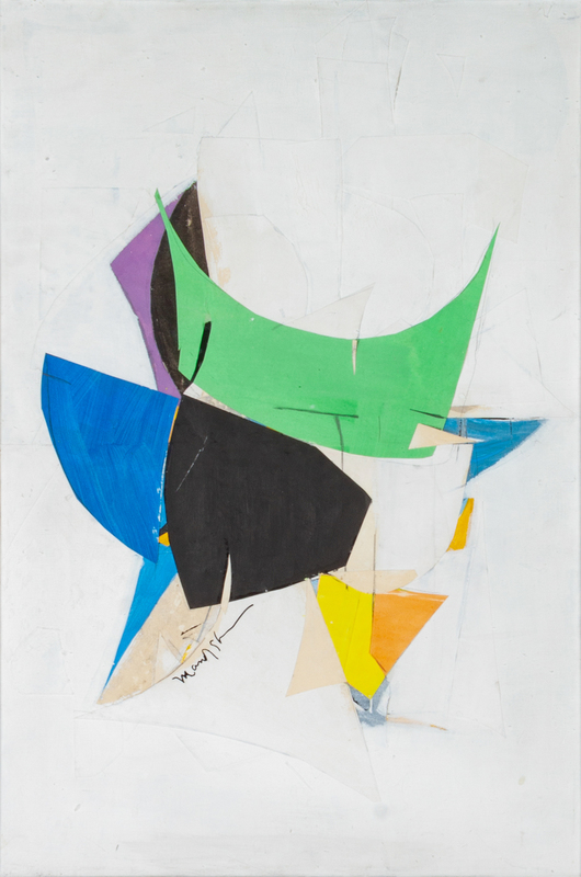 collage with gouache and pencil on canvas, signed Mandelman (lower left