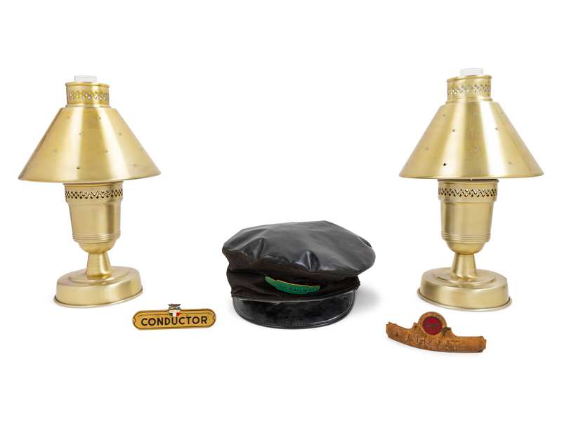 comprising a pair of brushed brass dinning car kerosene lanterns, a British Railways badge and cap, a Missouri Pacific Lines 'Agent' hat badge and another Conductor badge.