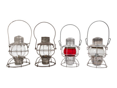 A Group of Four Chromed Metal Railroad Signal Lanterns