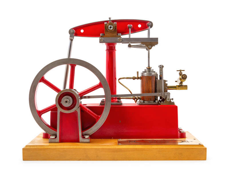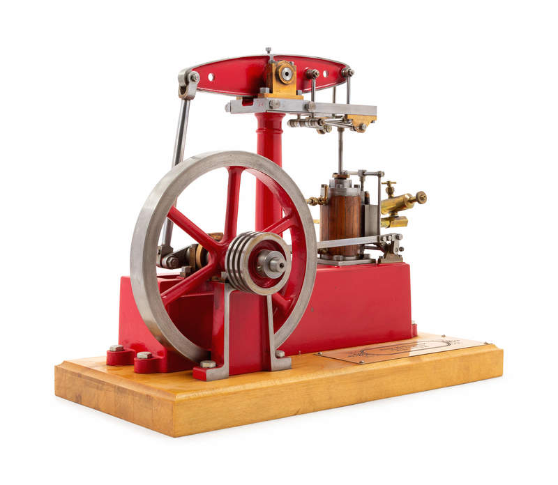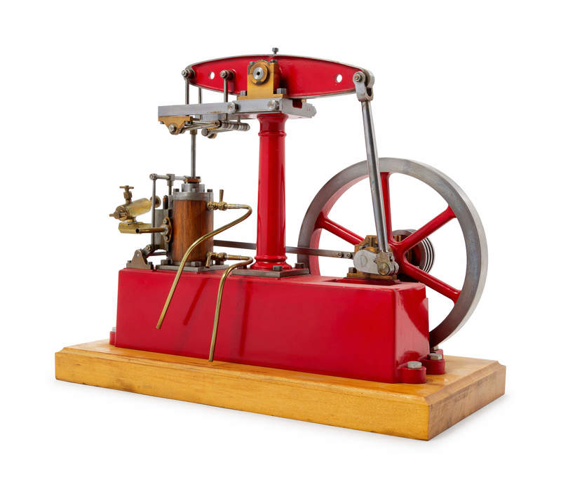 A Painted Metal Single Stroke Engine and Flywheel Scale Model