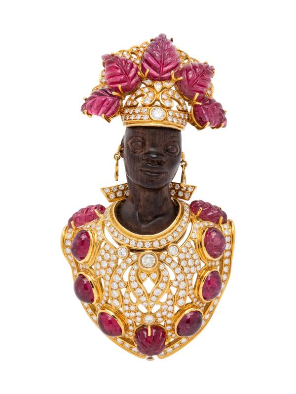 containing numerous round brilliant cut diamonds weighing approximately 8.00 carats total, 14 carved and cabochon cut tourmalines, with a carved wood face.