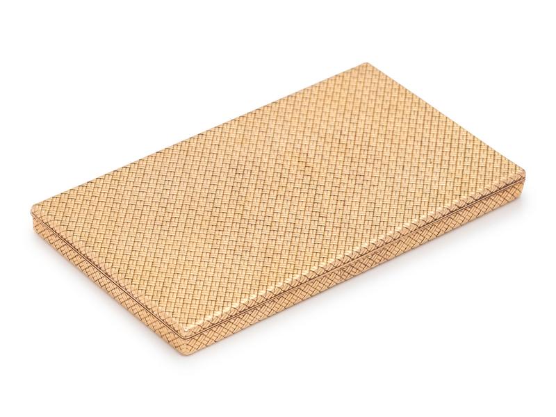 consisting of a textured gold hinged case measuring approximately 77.00 x 138.00 x 10.00 mm.