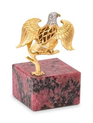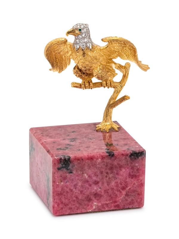 consisting of a sculpted eagle perched on a branch with a rhodonite base, containing numerous round brilliant cut diamonds and two round mixed cut emeralds, mounted in gold and platinum.