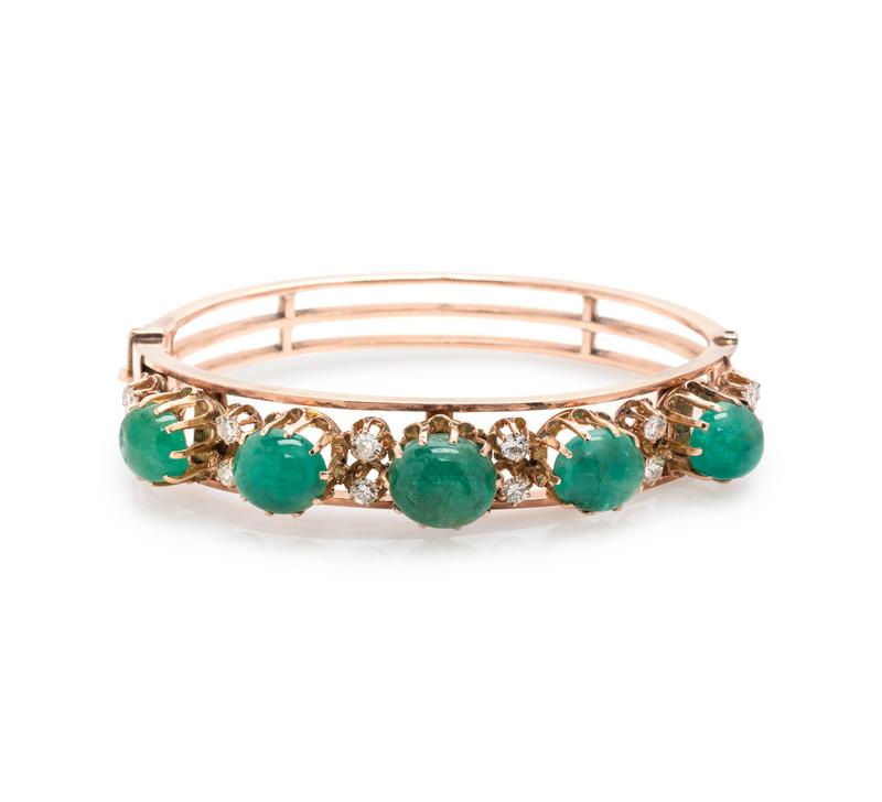containing five oval cabochon cut emeralds measuring approximately 7.80 x 9.00 to 9.00 x 10.30 mm and 12 round brilliant and old European cut diamonds weighing approximately 0.70 carat total, hinged with a side clasp.