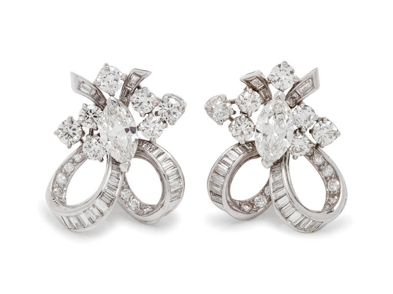 containing two marquise cut diamonds weighing approximately 1.90 carats total and 80 round brilliant and baguette cut diamonds weighing approximately 3.85 carats total, posts with clip backs, mounted in platinum.