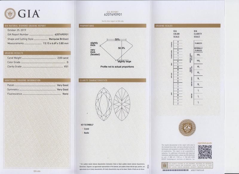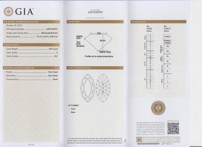 GIA, 2019, Report number 6207690901, 2.03 carats, D color, VS1 clarity, No fluorescence