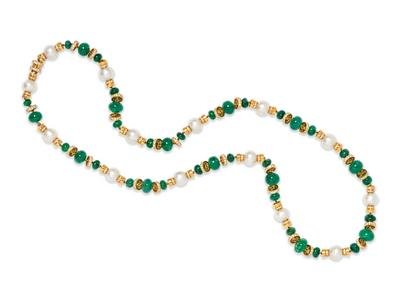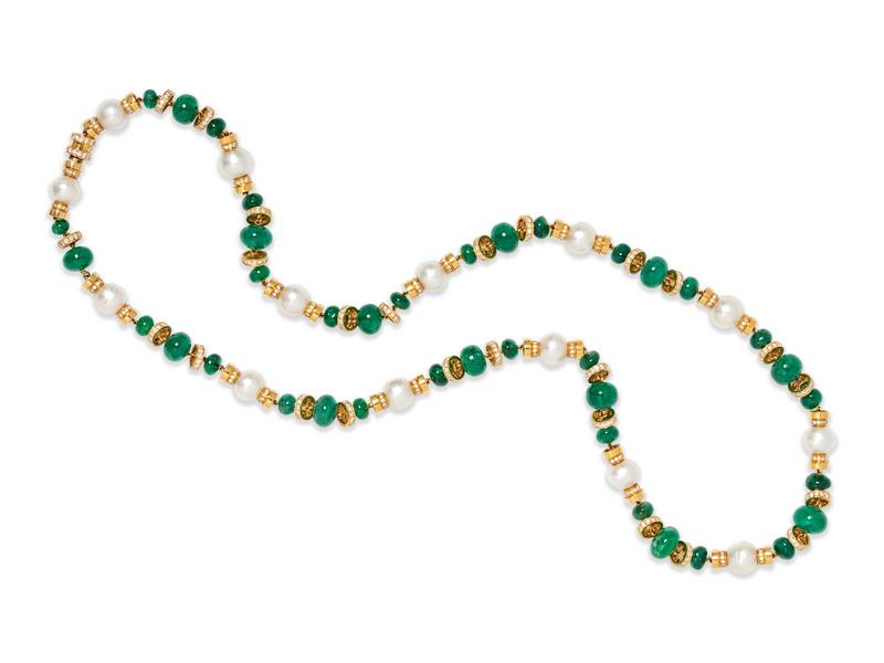 containing 686 round brilliant cut diamonds weighing approximately 10.00 carats total, 38 polished emerald beads measuring approximately 7.50 to 11.00 mm and 14 pearls measuring approximately 11.50 mm, mounted in yellow gold.