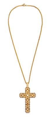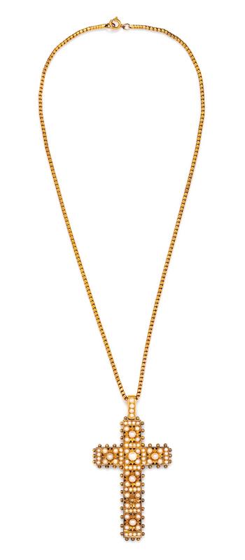 consisting of a cross pendant containing numerous seed pearls (origin not tested) measuring approximately 1.45-4.28 mm in diameter, suspended from a snake link chain.