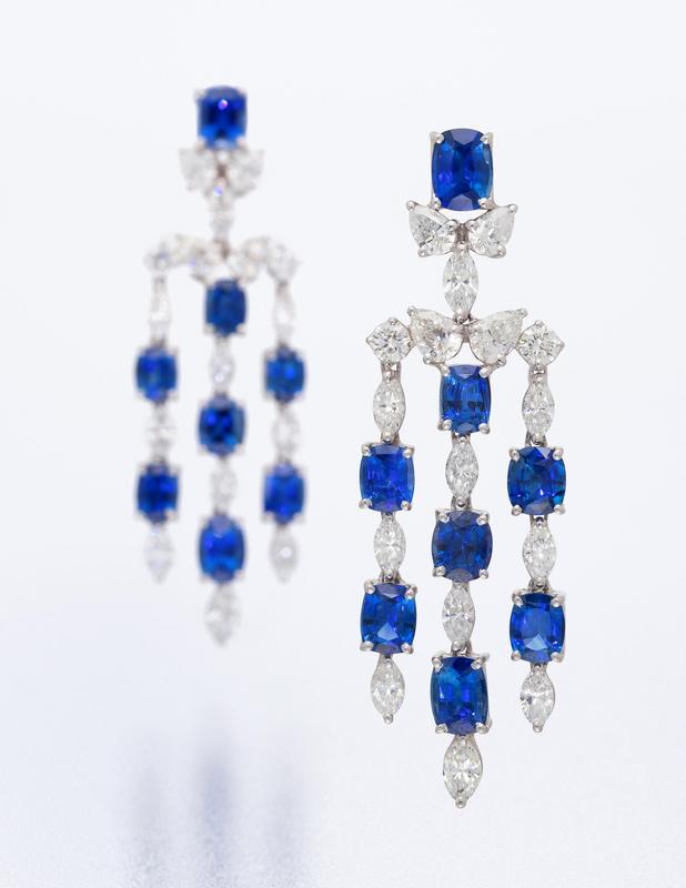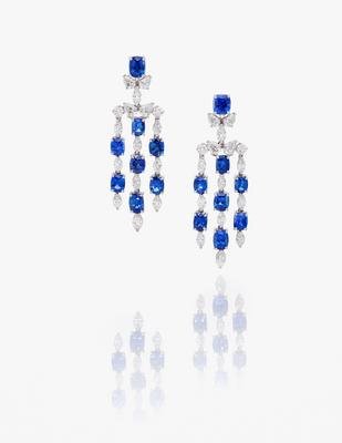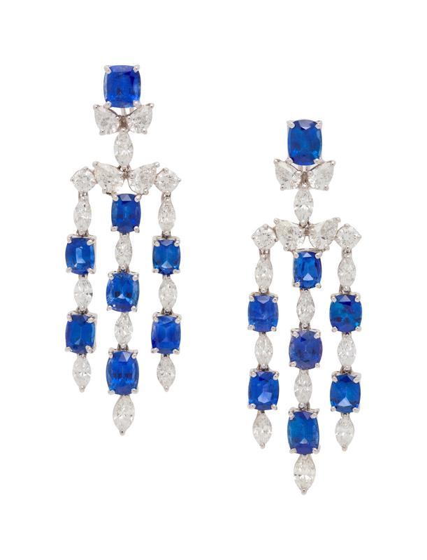 containing 16 cushion and oval mixed cut sapphires weighing 21.94 carats total and 20 marquise cut, eight pear shape and four round brilliant cut diamonds weighing 9.02 carats total, posts with clip backs.