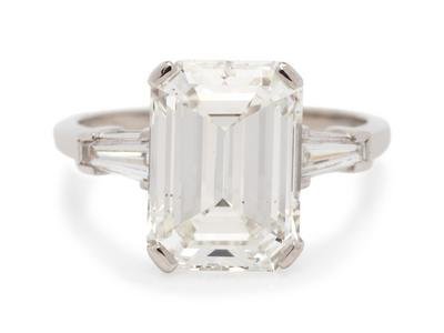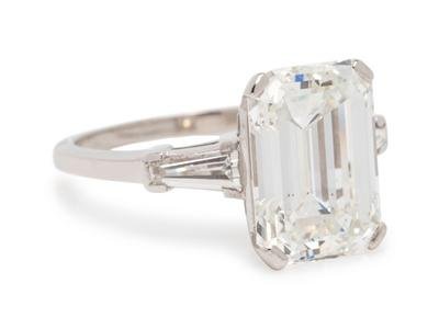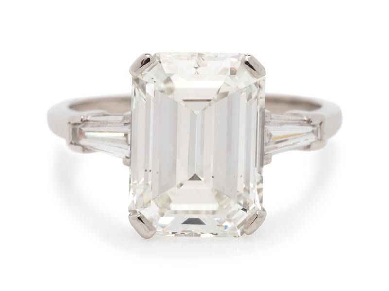 containing one emerald cut diamond weighing 5.62 carats and two baguette cut diamonds weighing approximately 0.50 carat total, mounted in platinum.