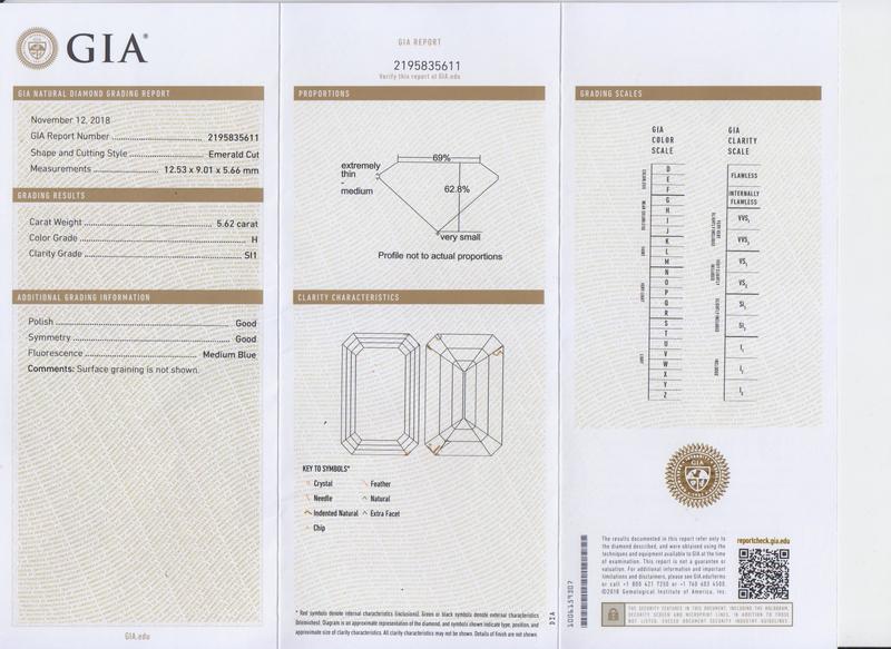 GIA, 2018, Report number 2195835611, 5.62 carats, H color, SI1 clarity, Medium blue fluorescence