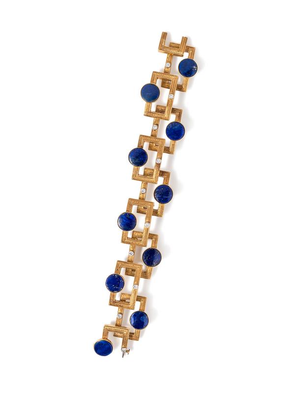containing 10 round lapis lazuli plaques measuring approximately 10.00 mm in diameter and 10 round brilliant cut diamonds weighing approximately 0.40 carat total, mounted in yellow gold.