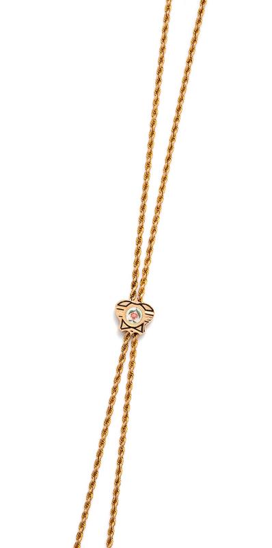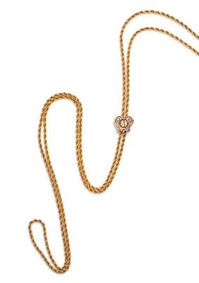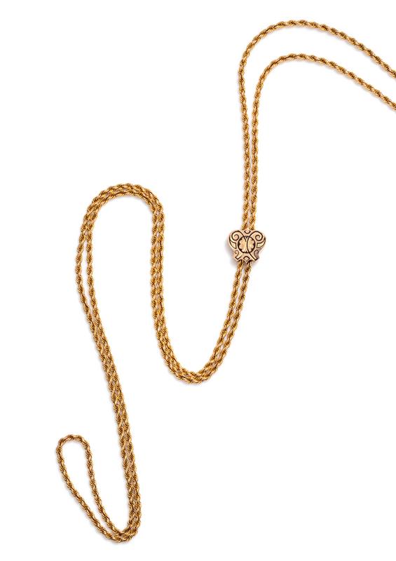 consisting of a gold rope chain measuring approximately 4.00 mm wide and accented with a polychrome enamel floral motif and black linear inlay, with later gold filled clasp.