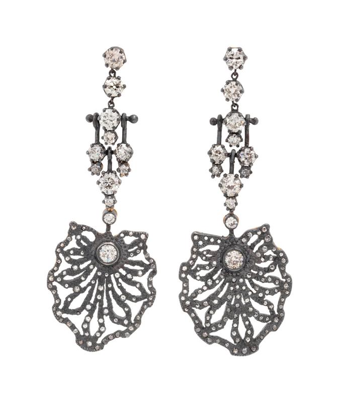 containing 24 old mine cut diamonds weighing approximately 4.55 carats total and numerous rose cut diamonds accenting the bottom drop section.