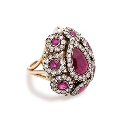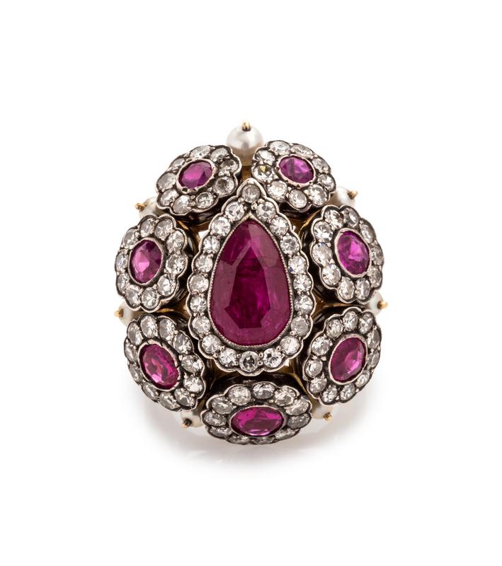 containing one pear shape step cut ruby measuring approximately 12.14 x 7.60 mm, seven round mixed cut rubies measuring approximately 3.67-5.15 mm in diameter, 91 round single cut diamonds weighing approximately 2.09 carats total and seven pearls measuring approximately 3.21-3.95 mm in diameter.