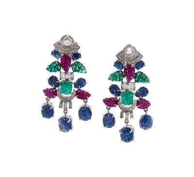 Diamond, Carved Emerald, Ruby and Sapphire Earclips