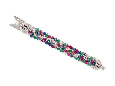 containing 15 carved leaf motif rubies, three drilled ruby beads, 11 carved leaf motif sapphires, three drilled sapphire beads, 13 carved leaf motif emeralds, and five drilled emerald beads weighing approximately 55.00 carats total, together with numerous round brilliant cut diamonds weighing approximately 8.00 carats total, the bracelet measuring approximately 22.00 mm wide.