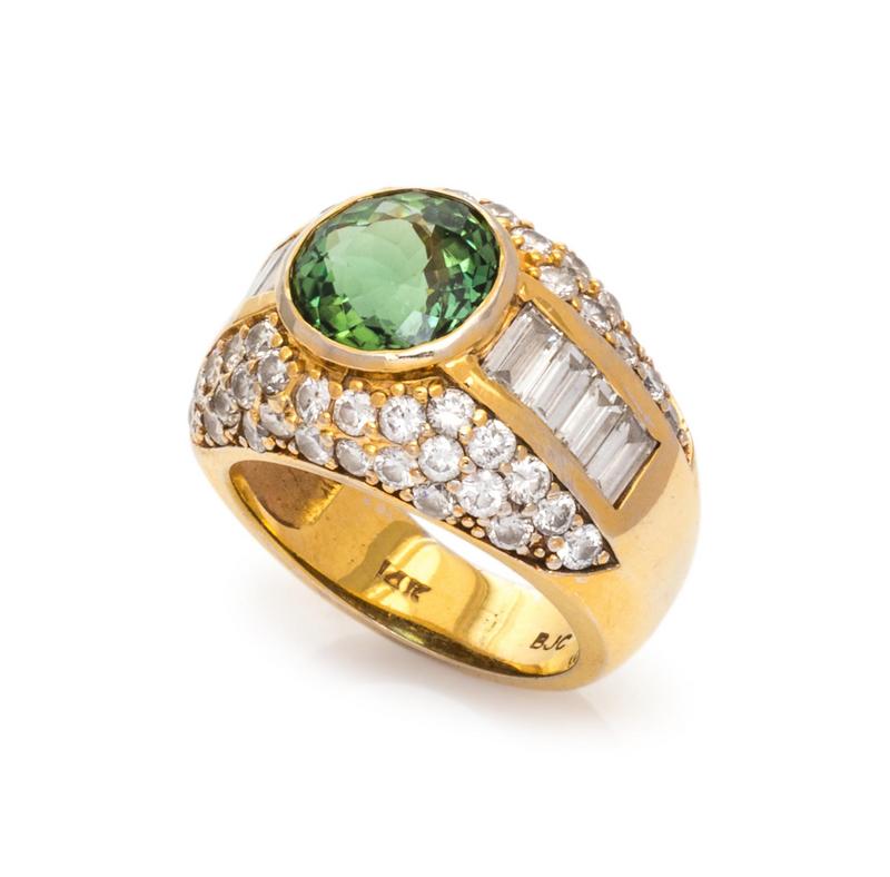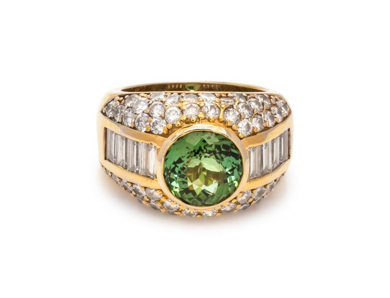 containing one round mixed cut green tourmaline weighing approximately 3.75 carats, 52 round brilliant cut diamonds weighing approximately 1.50 carats total and eight baguette cut diamonds weighing approximately 1.12 carats total.