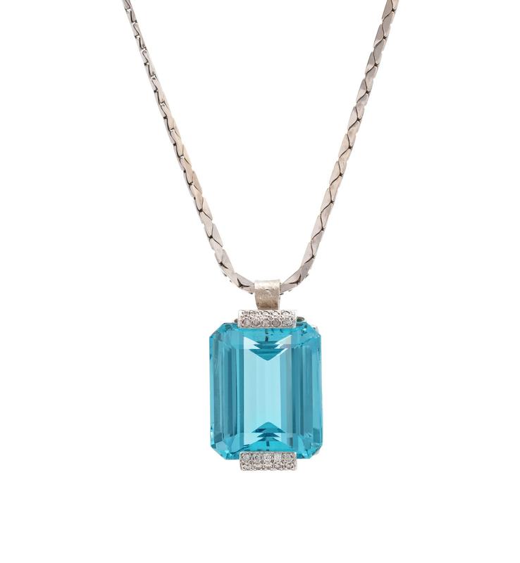 consisting of a pendant/brooch containing one octagonal step cut aquamarine measuring approximately 22.50 x 18.50 x 12.45 mm and 20 round single cut diamonds weighing approximately 0.40 carat total, suspended from a 14 karat gold cobra chain necklace.
