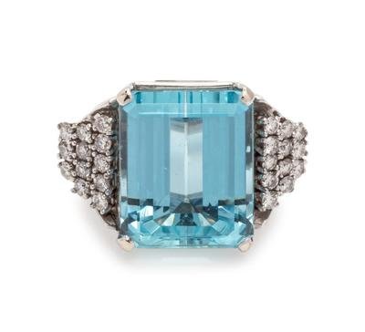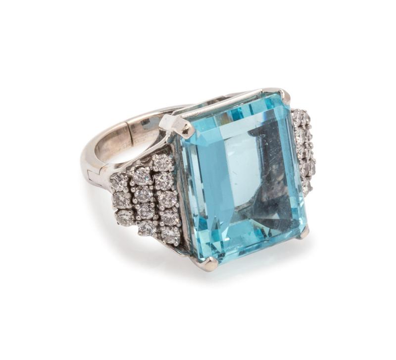 containing one octagonal step cut aquamarine measuring approximately 15.90 x 12.60 x 8.70 mm and 24 round brilliant cut diamonds weighing approximately 0.70 carat total.