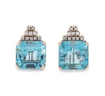 containing two octagonal step cut aquamarines measuring approximately 13.30 x 13.05 x 9.95 mm and 20 round brilliant cut diamonds weighing approximately 0.40 carat total, posts with clip backs.