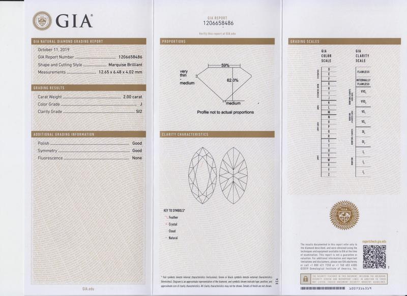 GIA, 2019, Report number 1206658486, 2.00 carats, J color, SI2 clarity, No fluorescence