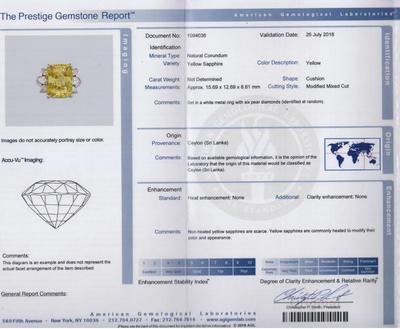 AGL, 2018, Report number 1094036, Natural Corundum, Yellow Sapphire, Ceylon (Sri Lanka), Unheated
