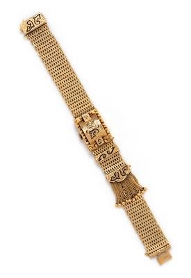 consisting of a hinged dial cover and slide accented with black enamel 17.00 x 22.00 mm case dimensions, matte silvered dial signed PERLE, black Arabic and gold dot numerals, gold pencil hands, snap on case back, Cal. 976 17 jewel manual wind movement signed P. BUHRE, integrated mesh link bracelet, enameled box clasp.