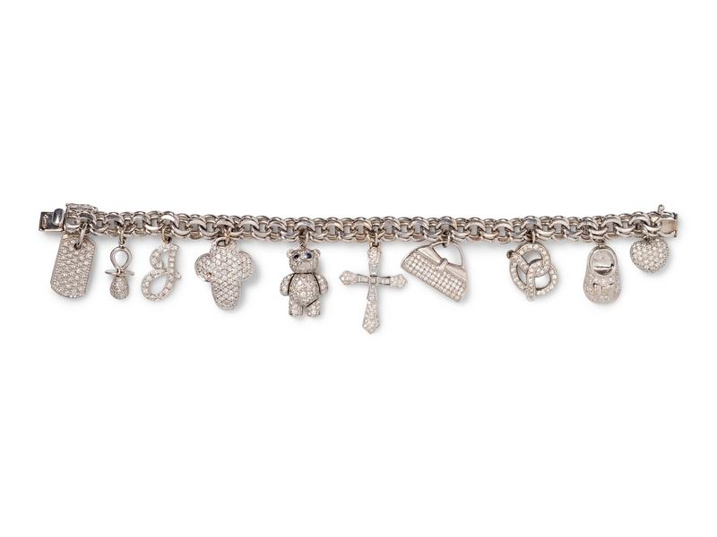 consisting of ten charms including a 14 karat gold and diamond monogram charm, a 14 karat gold and diamond pacifier charm, a diamond "J" charm, a diamond cross charm, a diamond teddy bear charm, an 18 karat gold and diamond cross charm, an 18 karat gold and diamond purse charm, a diamond pretzel charm, a diamond baby shoe charm together with a diamond heart charm, all charms containing numerous diamonds weighing approximately 4.35 carats total.
