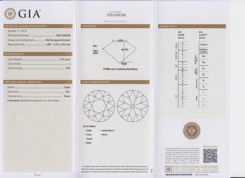 GIA, 2019, Report number 5201658258, 1.45 carats, L color, VS2 clarity, No fluorescence