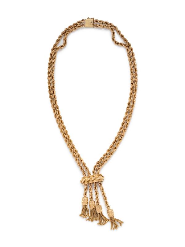 consisting of a double row rope chain ending with a four row tassel having quilted textured finials and chain fringe.