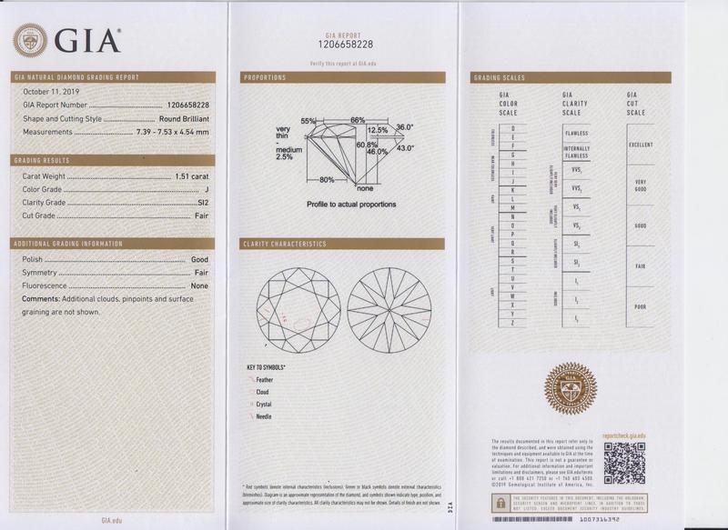 GIA, 2019, Report number 1206658228, 1.51 carats, J color, SI2 clarity, No fluorescence