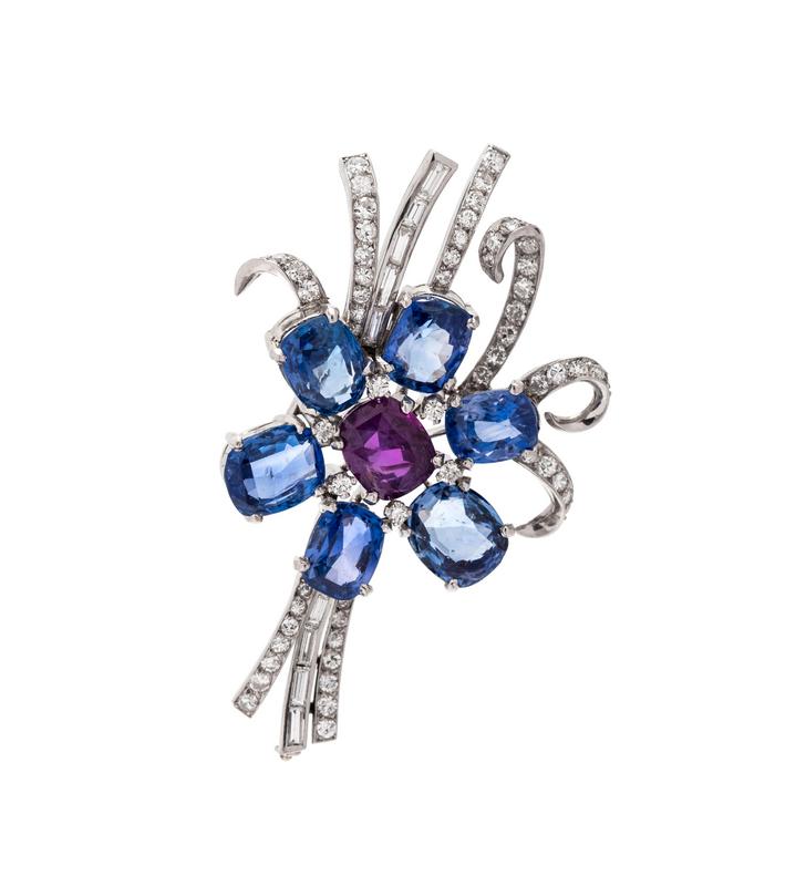 containing six mixed cut blue sapphires weighing approximately 9.05 carats total, one mixed cut purple sapphire weighing approximately 2.15 carats, nine baguette cut diamonds weighing approximately 0.25 carat total and numerous round brilliant and single cut diamonds weighing approximately 1.15 carats total.