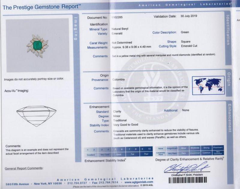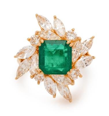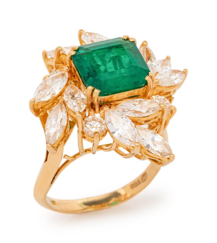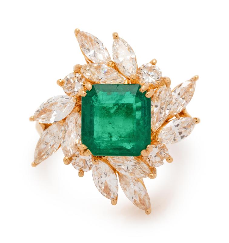 containing one emerald cut emerald measuring approximately 9.38 x 9.06 x 4.49 mm, four round brilliant cut diamonds weighing approximately 0.40 carat total and 12 marquise cut diamonds weighing approximately 2.15 carats total.