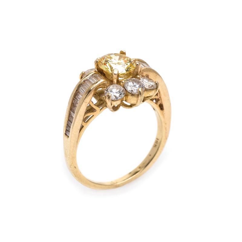 containing one round brilliant cut fancy intense yellow diamond weighing 0.76 carat, six round brilliant cut diamonds weighing approximately 0.66 carat total and numerous baguette cut diamonds.