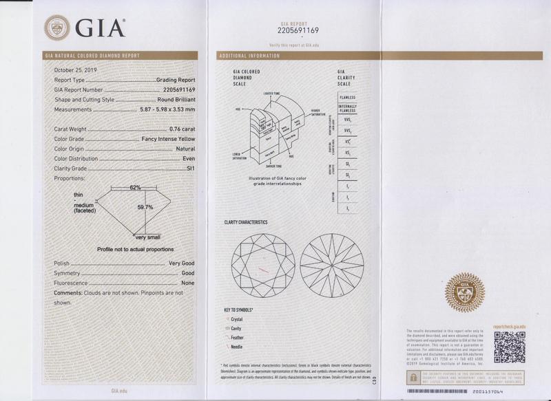 GIA, 2019, Report number 2205691169, 0.76 carat, Fancy Intense Yellow color, SI1 clarity, No fluorescence