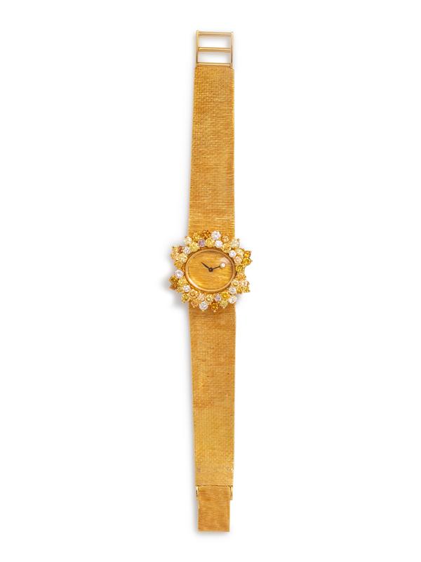 18.00 mm case diameter, brushed gold dial, black hands with one round brilliant cut diamond, the bezel containing 46 round brilliant cut diamonds and colored diamonds (origin not tested) weighing approximately 3.00 carats total, snap on case back, 17 jewel manual wind movement signed MOVADO, brushed finish mesh link bracelet, fold over clasp.